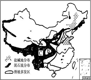 2、综合题 下图为“我国盐碱化地区和滑坡、泥石流多发区的分布示意图”。读图完成下列问题。