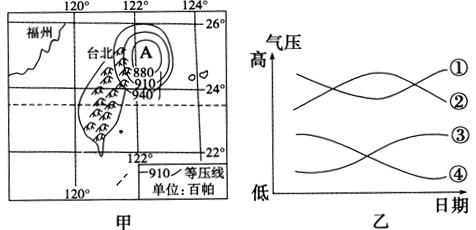 1.此时,台北的风向是2.若A天气系统向西移动经过福州,乙图中四条曲线最能反映福州气压变化过程的是3.若A天气系统向西移动,福建山区可能发生的地质灾害是