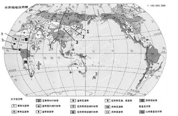 A.月平均气温大于0℃,降水量较多 B.月平均气温小于0℃,降水量较多 C.月平均气温大于0℃,降水量较少 D.月平均气温小于0℃,降水量较少 5、综合题  下图为世界陆地自然带分布。读图回答(14分)  |