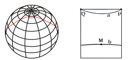 5、单选题 下面两幅图均示意地球表面,其中右图所示区域取自左图中方框所示部分。右图所示区域在北半球,弧线a为纬线,Q、P两点的经度差为90°;弧线b为晨昏线,M点为b线的纬度最高点。读右图,回答下列各题。