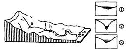 5、单选题 读下图,比较图中河流a,b,c三处的位置与三幅剖面图,回答