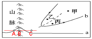 本题解析:试题分析: 1.地球自转线速度旋半径越大,线速度越大,山脉处地势高,地球自转线速度大于同纬度的两侧地区(如下图B大于AC),地球自转线速度等速线应该向速度低的地方凸出,结合图中山脉处地球自转线速度等速线向北凸出,说明越往北地球自转线速度越低,故可以判断图示地区应该位于北半球。图中稳定风向轨迹呈逆时针,北半球低压中心呈逆时针辐合,故可判断甲地位于低压中心。
