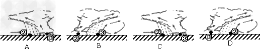 【小题2】由上题可知该天气系统为冷锋,出现在气旋上,且位于锋面气旋的西侧。图中CD位于反气旋上,为高压脊不可能形成冷锋;B位于气旋上,但位于东侧,为暖锋;A位于气旋上,且位于西侧,为冷锋。