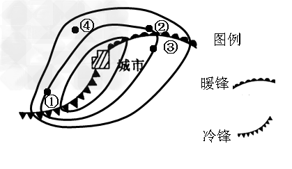 1.关于图中①②③④四地天气特征的叙述,正确的是