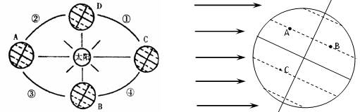 (3)图右所示这一天中,A、B两地先见到日出的是???????地;A、B、C三
