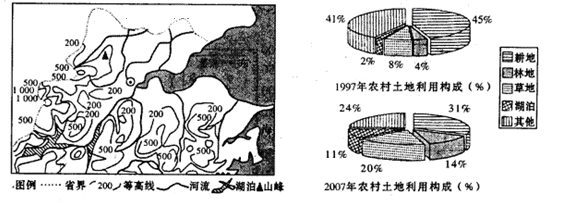 (2)对比十年农村土地利用构成变化,林地、草地和湖泊比重增加,耕地比重降低,则可知十年间,该区域退耕还林、还草、还湖,林地草地比重上升,湖泊面积增大,河流流量的季节变化减少,河流含沙量减少。