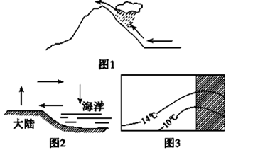 【小题1】根据图1可知,山地迎风坡水汽受地形抬升形成的降水是地形雨。锋面雨是指冷气团和暖气团相遇,暖气团被抬升,形成的降雨。根据图2中显示的循环过程判断,该循环分布于海洋于陆地之间,而海陆间水循环应为海洋水汽蒸发,陆地形成降水,于图示不相符。图中陆地盛行上升气流,海洋盛行下沉气流,近地面的风从海洋吹向陆地,故应该为夏季风。