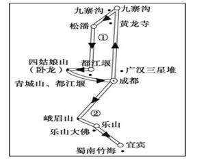 5、综合题 图为“以成都为中心的川西地区旅游热线示意图”,读图回答下列各题。(13分)