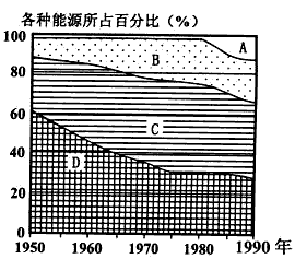1、上图是20世纪50年代以后世界能源消费构成的变化图,图中A、B、C、D表示煤的字母代号是