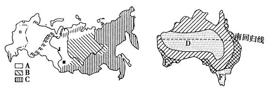 (2)澳大利亚自然地理分布图所表示的自然环境要素是________,其中E表示________,F表示________。