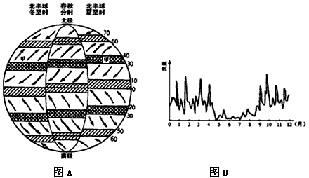 5、单选题 ??? 图A为“全球气压带和风带分布及移动示意图”,图B为“图A中甲地某河流量过程曲线图”,甲地河流以雨水补给为主。读图回答1—2题。