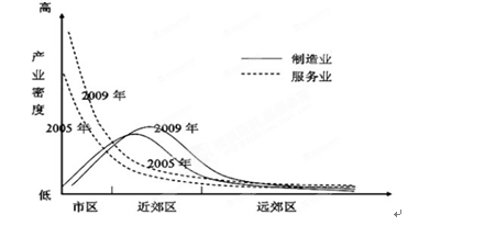 小题2:根据图中信息可知,服务业曲线上升,产业密度增加;制造业向近郊区集中,产业密度增加。城市的功能分区明显。正确的是B项。