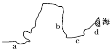 小题2:d处位于黄河下游三角洲,黄河含沙量大,因此三角洲增长速度快,因泥沙淤积严重,没有便捷的内河航运和航海运输。黄河下游由于地势低平,夏季易涝,地下水位高,多盐碱地、低湿地等中低产田,农业产量低。