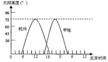 A.23.5oS~66.5oS B.23.5oN~23.5oS C.0o~23.5 oN D.0o~23.5 oS 2、综合题 观察我国某地(40°N)屋内朝南窗户的阳光照射情况以及地球公转示意图(图中A、B、C、D代表二分二至点),据此回答下列问题。(10分) 3、综合题 读杭州(30°N,120°E)和甲地某日太阳高度日变化图,完成下列各题。(10分) 4、单选题 冬至日,正午太阳高度角达到一年中最小值的范围是: 5、单选题 当太阳直射点位于右图中D点这一天时 |