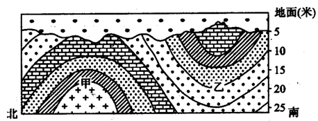 第(4)题,本题考查地质构造规律的应用。在甲、乙两地中,若想打一眼水井应该选择在乙地,若想钻探石油应该选择甲地。