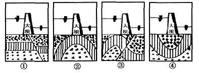 5、单选题 选择坝址是修建水库的关键之一。下图中所示方案中,构造稳定,地基稳定,地基坚实,最适宜建坝的是( )