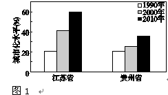 5、综合题 图1为江苏省和贵州省三个年份城市化水平统计图。读图回答问题。