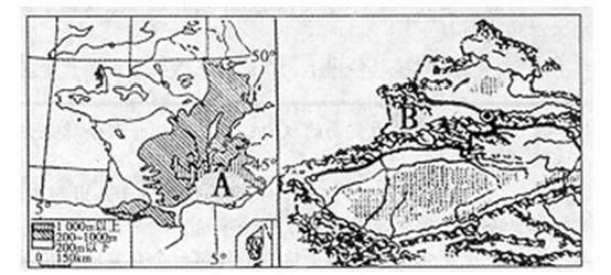 (2)由图中信息可知,法国A处为地中海沿岸,为地中海气候区,夏季高温多少,冬季温和多雨,而新疆B地为温带大陆性气候,全年降水较少,夏热冬寒。因此共同性就是夏季高温少雨,光照强。