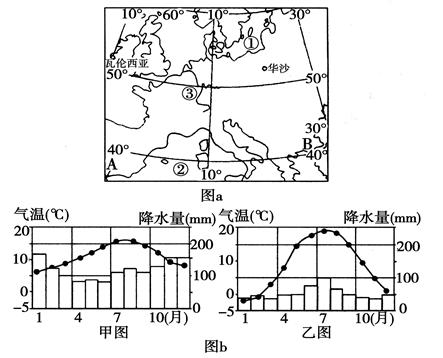 (1)图b所示甲图和乙图中,表示华沙的是________图。分析瓦伦西亚气候特征的形成原因。(3分)