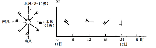 本题解析:小题1:根据图示,风尾为旗帜的风速达8-12级,风速最大。12时前后风速大。所以本题选择B选项。