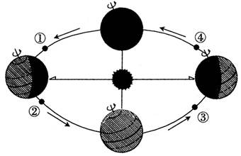 5、单选题 下图中N为北极点,O为昼半球的中心点,阴影部分位于西半球,非阴影部分位于东半球。读图回答问题。