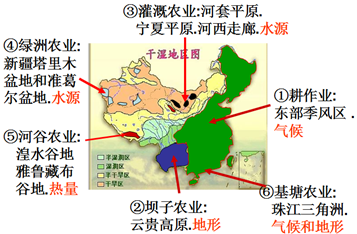 点评:本题借助表格内容考查不同区域农业区位的影响因素,题目难度较小,下图为中国不同区域影响农业生产的主导因素。