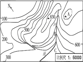 4、单选题 下图是某区域等高线示意图(单位:米),根据图示信息完成下列问题。1.山顶A的海拔和陡崖C的相对高度组合正确的是2.下列说法正确的是