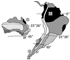本题解析:本题考查世界区域的比较分析。(1)图示①位于澳大利亚的东南部,为亚热带湿润性季风气候;成因与东亚季风成因一致,为海陆热力性质的差异;②位于30°--40°的大陆西岸,为地中海气候。成因主要从气压带风带的移动分析。(2)③④两地的气候差异主要从地形对气候的影响分析。(3)⑤位于澳大利亚东北部,受地形对气候的影响和沿岸暖流影响而形成热带雨林,⑥位于亚马逊平 原,从大气环流和平原分布判断其成因。