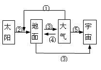 3、单选题 图中各箭头及其代表符号①②③④⑤表示太阳、地面、大气、宇宙空间之间的热力作用,其中包括太阳辐射、地面辐射、大气辐射、大气逆辐射、削弱作用(吸收、反射和散射),回答小题