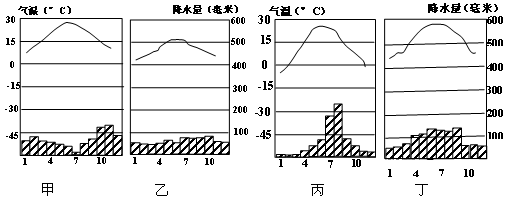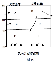 (2)根据甲、乙、丙、丁四种气候类型的分布规律,在图13中与其相对应的位置分别是(填写代表字母) 、 、 、