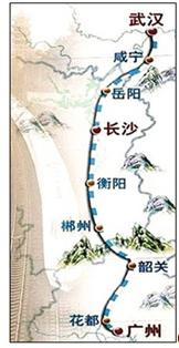 该图是武广高铁线路分布情况。武广高铁2009年12月26日正式运营,使武汉到广州运行最短时间缩短至3小时16分。线路全长1068.8千米,全线共有桥梁684座、隧道226座,桥隧所占线路比例近70%。