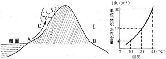 1.若在海平面附近A处有20℃的1立方米空气,含有水汽17克,如右图所示已达到饱和。当它上升到C处时有8克水汽析出,那么C处的海拔约为2.若AC间的高度与IB的高度相同,但是AC间的温度变化小于IB间的变化,原因是3.不是由左图所示原因形成的降水差异是