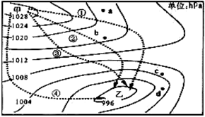 2.出现阴雨天气应在低压槽处或低压中心,由图可知ab处于高压脊,cd来源:91 考试网处于低压槽处,而根据风向可在cd处形成暖锋,c是暖气团一侧,d是冷气团一侧,因此d出现阴雨天气最可能。