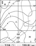 1.根据图示经纬度和等值线数值,可以判断此图为东北地区。甲和丙分别为大兴安岭和长白山,乙为东北平原,所以,乙的气温高于甲和乙。东北地区多数河流都有春汛和夏汛两次汛期 ,河流靠的是季节性积雪融水和大气降水补给,而有些河流的河段是从低纬流向高纬的,会有凌汛现象。