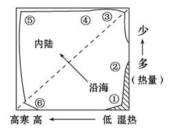 1.图中横坐标从西向东表示热量和降水的变化是从高寒逐渐变为湿热,而纵坐标从北向南表示热量逐渐增多,所以图中最能反映自然景观从沿海向内陆的地域分异规律(降水从东部沿海到西部内陆逐渐减少)的是③-④-⑤的变化。