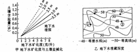 1.若地下水矿化度为5克/升,则乙图中土壤含盐量大于等于0.8%的点有2.下列判断正确的是