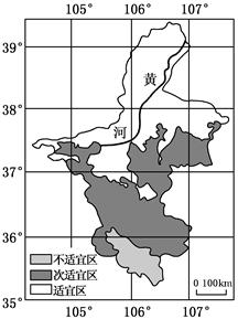 单选题 根据枸杞产量与气候条件的关系,把宁夏划为枸杞的适宜、次适宜和不适宜种植区,从而为枸杞种植的合理布局提供了参考依据。读图,回答下列问题。