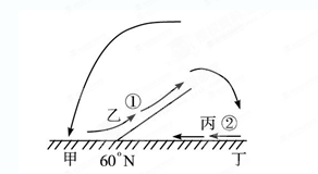 本题解析:试题分析:小题1:根据图示60°N附近的极锋的分布判断乙沿着锋面上升,为暖气团,源于30°N附近的副热带高压带;丙为位于锋面下的冷空气,源于极地的极地高压带。故A项正确。