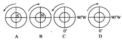 3、单选题 下面四幅图能正确表示地球自转方向的是( )