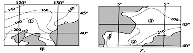 【小题1】由图中可以看出,甲是位于我国东北地区南部及华北平原北部,而平均气温≥10℃日的等值线向低处弯曲,说明弯曲处的等值线要比旁边的更多,是因为此处是平原地形,气温相对更高;而乙处是欧洲的伊比利亚半岛,等值线向高处弯曲,说明其气温相对更低,是因为此处是山地,两者都是受地形的影响,故选D.