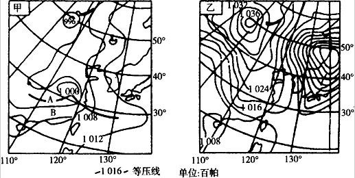 2、综合题 甲、乙两图分别为“同一地区不同时间的等压线分布示意图”,读图完成下列各题。