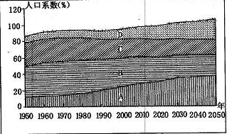 3、单选题  图为发达国家与发展中国家老年人口与少年儿童年龄系数示意图。其中A为发达国家老年人口年龄系数(一定时期老年人口占总人口的比重)。读图,回答下题。