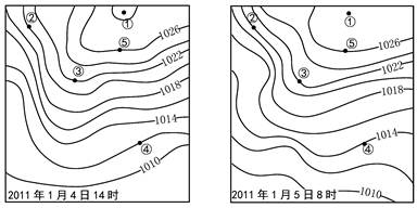 4、单选题 下图示意北半球某区域2011年1月4日14时和5日8时海平面气压(单位:百帕)分布,读图完成下列小题。