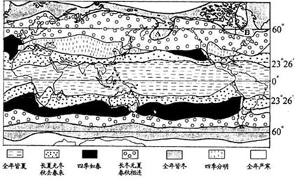 (1)世界四季类型空间分布的特点是 ,(2分)