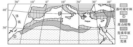 (1)图中植被栙表示?????????????????,这类植被分布地区出产优质葡萄,主要自然原因是???????????????????????。(6分)