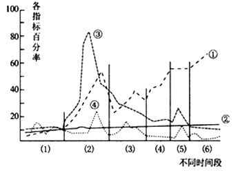 4、单选题 下图中四条折线分别表示某河段①污水排放量,②人口数量,③流量,④渔业资源量等四个因子的变化情况。读图回答1~2题。