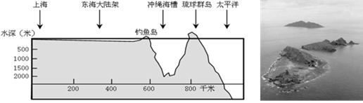 4、单选题 散布在海洋、河流或湖泊中的四面环水、高潮时露出水面、自然形成的陆地叫岛屿。由海水环绕而成的岛,也专称海岛。图中左图为东海底地形剖面图,右图为我国钓鱼岛照片。读图完成题。