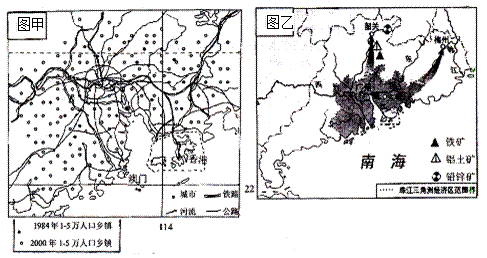 5、综合题 读珠江三角洲城镇图(图甲)、珠三角经济区扩展图(图乙)及材料,并根据有关地理知识回答各题。