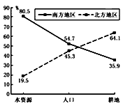 4、单选题 读“我国南、北方水资源、人口及耕地分布对照图,回答1—2题。