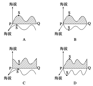 【小题2】据图可知:从P到Q依次经过山坡、山脊(S)、山坡、山谷、山坡、山脊、山坡,据此判断剖面图:山脊处的等高线凸向地处,山谷处等高线凸向高处,据此判断等高线的分布所以本题A正确。